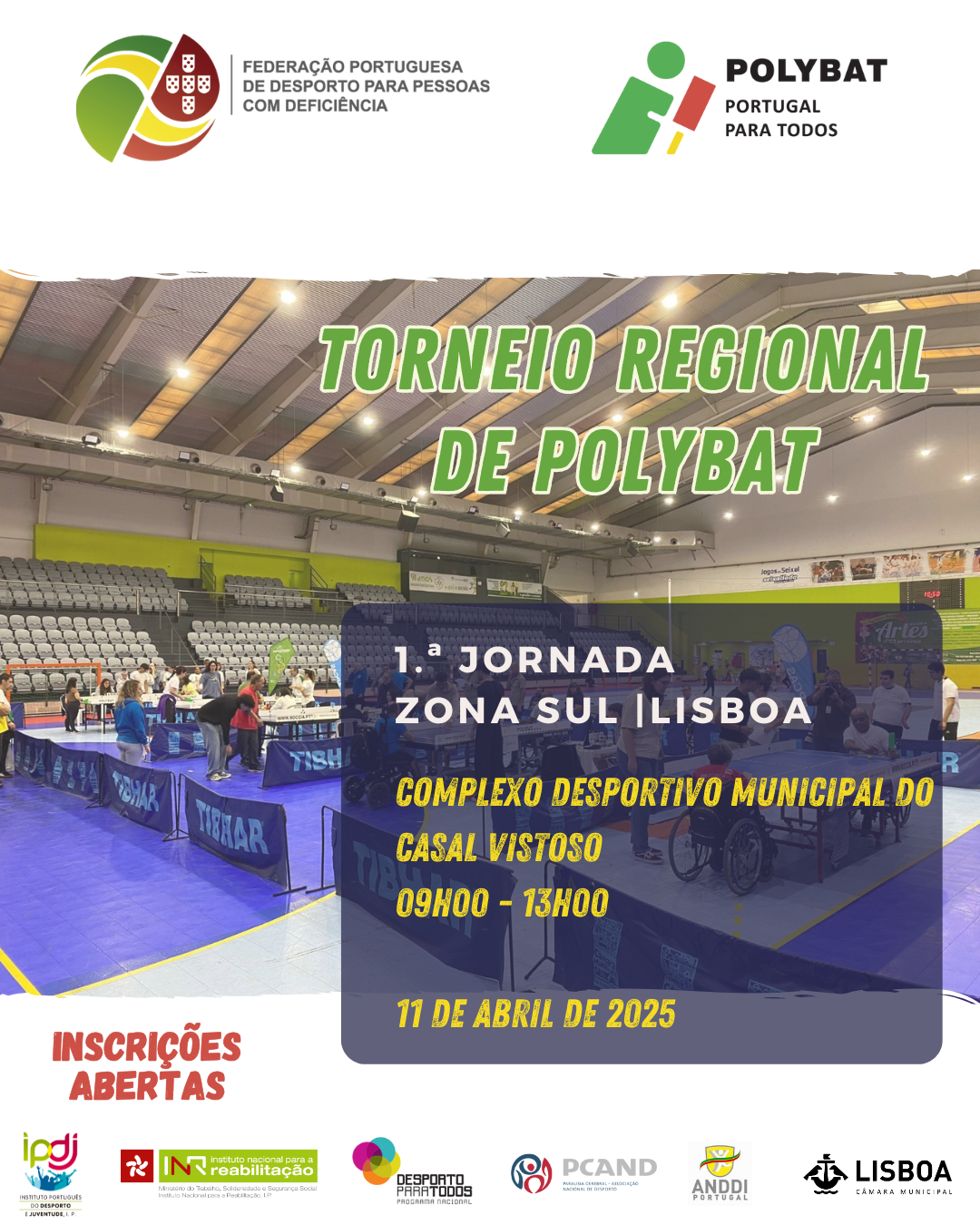 No âmbito do projeto “Polybat Portugal para Todos”, a Federação Portuguesa de Desporto para Pessoas com Deficiência (FPDD), em parceria com a Câmara Municipal de Lisboa, organiza a 1ª Jornada do 1º Torneio Regional de Polybat – Zona Sul.