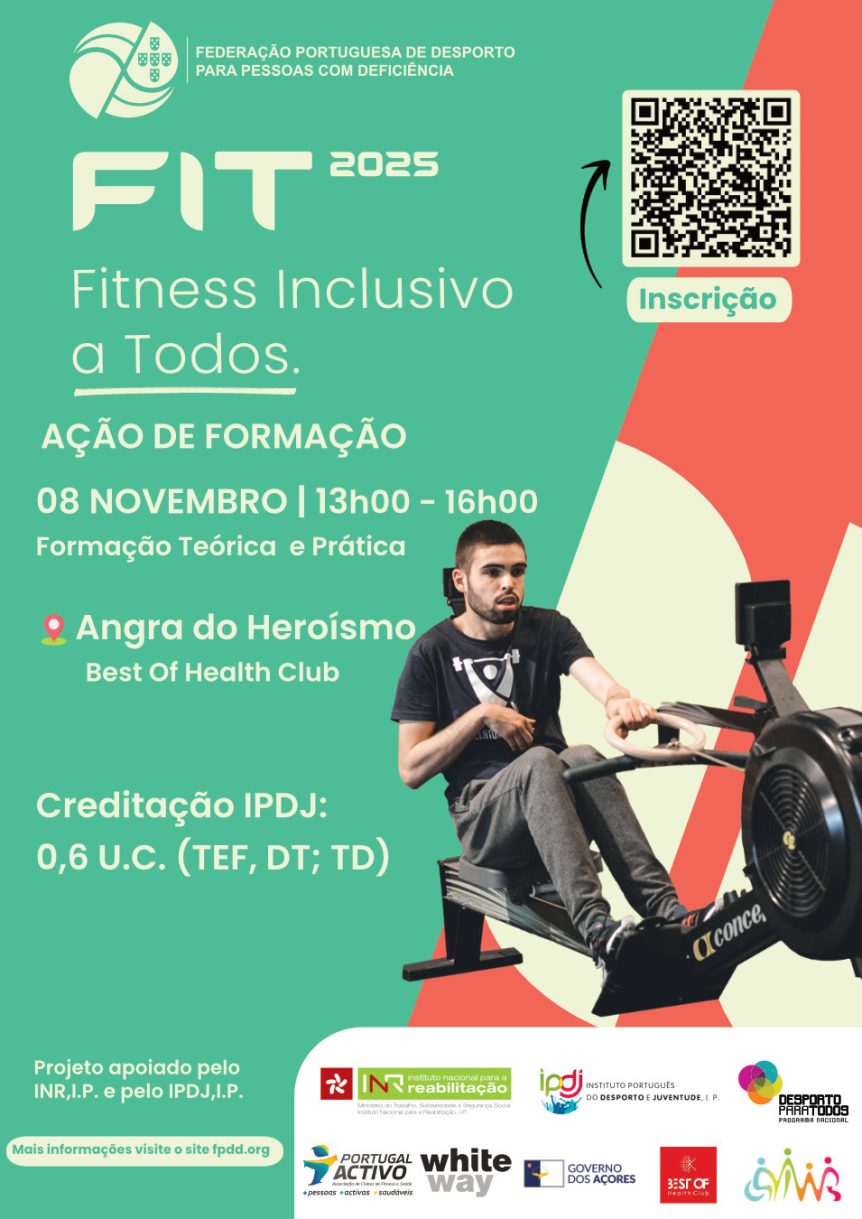 No âmbito do Projeto FIT — Fitness Inclusivo a Todos 2025, a FPDD em parceria com o Governo dos Açores e a Portugal Activo, irá organizar uma Ação de Formação e Capacitação dirigida aos seguintes destinatários: Técnico de Exercício Físico; Diretor Técnico; Treinador de Desporto; Proprietário de Ginásio; Gerente de Ginásio; Professor de Educação Física e Estudantes da área, que pretendam intervir no domínio da atividade física regular para Pessoas com Deficiência e Incapacidade.