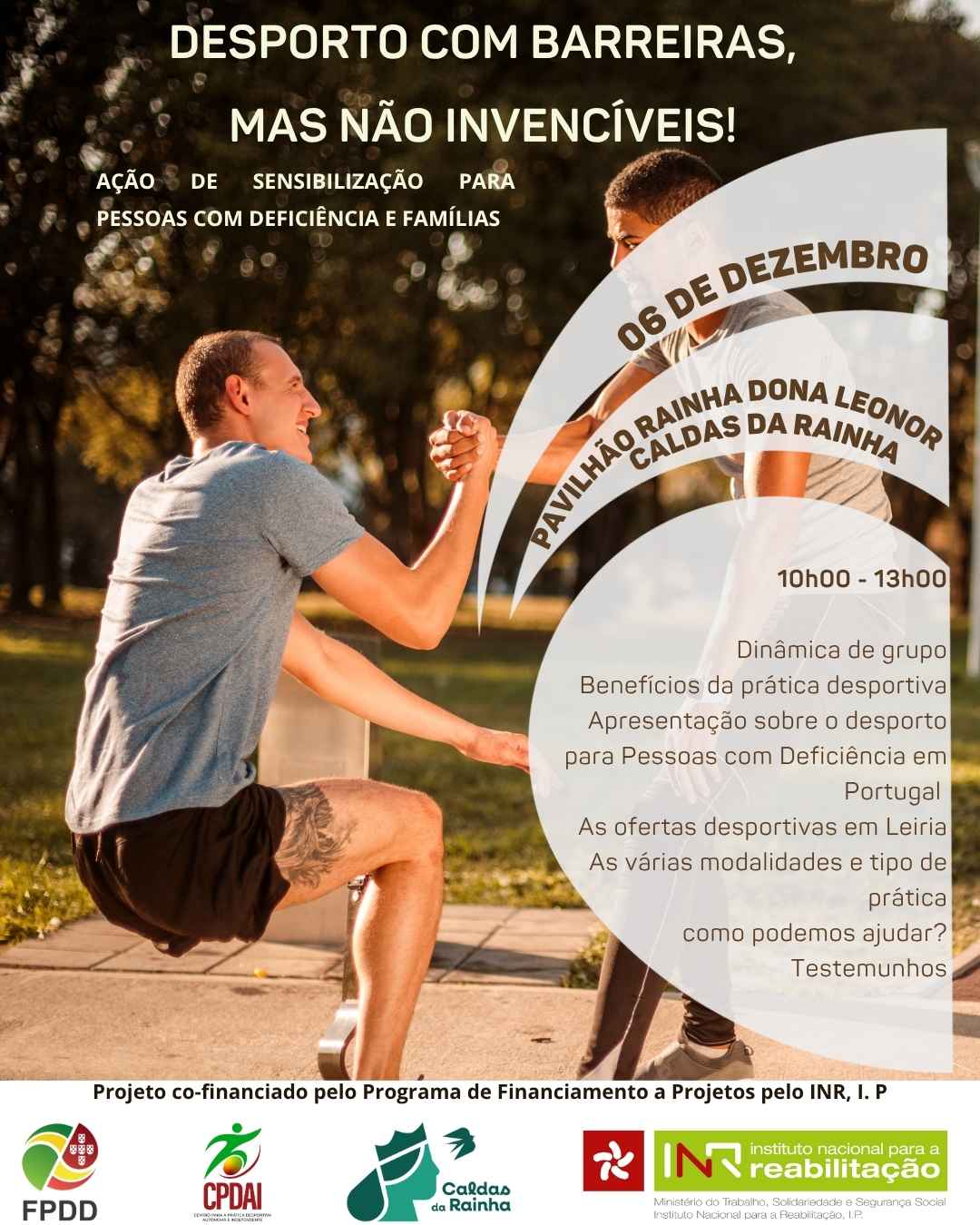 O Centro para a Prática Desportiva Autónoma e Independente (CPDAI) criado em 2024 pela FPDD, que tem como objetivo promover a inclusão de pessoas com deficiência no desporto e atividade física, alinhado à Estratégia Nacional de Inclusão. Irá, em parceria com a Câmara Municipal de Caldas da Rainha, realizar uma ação de sensibilização para as pessoas com deficiência e famílias no próximo dia 06 de dezembro pelas 10h00 no Pavilhão Rainha Dona Leonor.