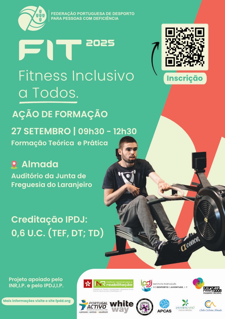No âmbito do Projeto FIT — Fitness Inclusivo a Todos 2025, a FPDD em parceria com o Clube de Ciclismo de Almada e a Portugal Activo, irá organizar uma Ação de Formação e Capacitação dirigida aos seguintes destinatários: Técnico de Exercício Físico; Diretor Técnico; Treinador de Desporto; Proprietário de Ginásio; Gerente de Ginásio; Administrador; Professor de Educação Física e Estudantes da área, que pretendam intervir no domínio da atividade física regular para Pessoas com Deficiência e Incapacidade.