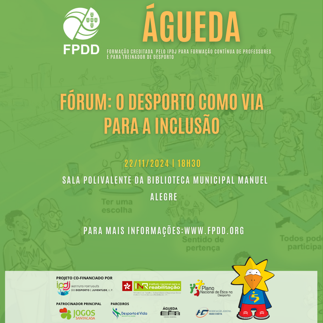 A Federação Portuguesa de Desporto para Pessoas com Deficiência (FPDD) realizará, no dia 22 de novembro, em Águeda, o fórum “O Desporto como Via para a Inclusão”, contando com a parceria da Câmara Municipal de Águeda e da Associação Hugo Costa.